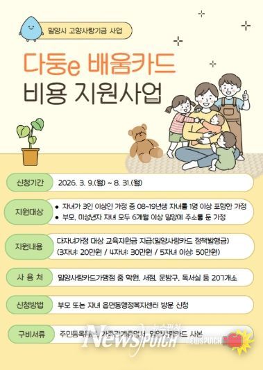 뉴스펀치 박세훈 기자 | 경남 밀양시는 다자녀 가정의 교육비 부담을 경감하고 아이 키우기 좋은 환경을 조성하기 위해 ‘다둥e 배움카드 지원 사업’을 본격 시행한다.