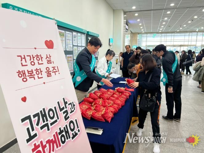 뉴스펀치 김윤걸 기자 | 울주군시설관리공단 울주종합체육센터가 3월 3일 정월대보름을 맞아 센터 이용객 및 지역 주민들을 대상으로 한 해의 건강과 무사태평을 기원하는 ‘부럼깨기 복주머니 증정 행사’를 개최했다.