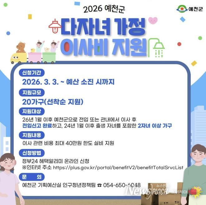 뉴스펀치 박세훈 기자 | 예천군은 다자녀 가정의 경제적 부담을 완화하고 안정적인 생활 정착을 돕기 위해 ‘2026년 다자녀 가정 이사비 지원 및 농수산물 쿠폰 지원사업’을 시행한다고 밝혔다.