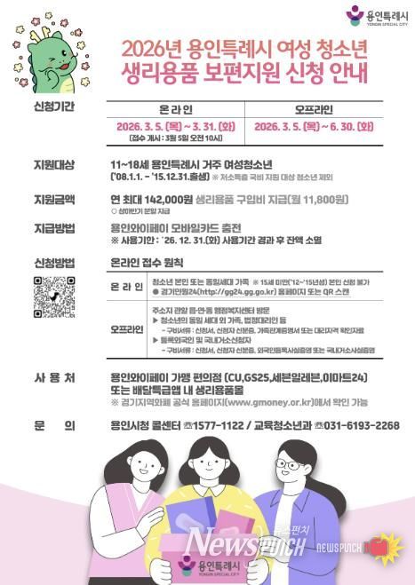 뉴스펀치 박상훈 기자 | 용인특례시는 경기도 지침 변경에 따라 5일부터 여성 청소년 생리용품 보편지원 사업 신청을 받는다고 밝혔다.