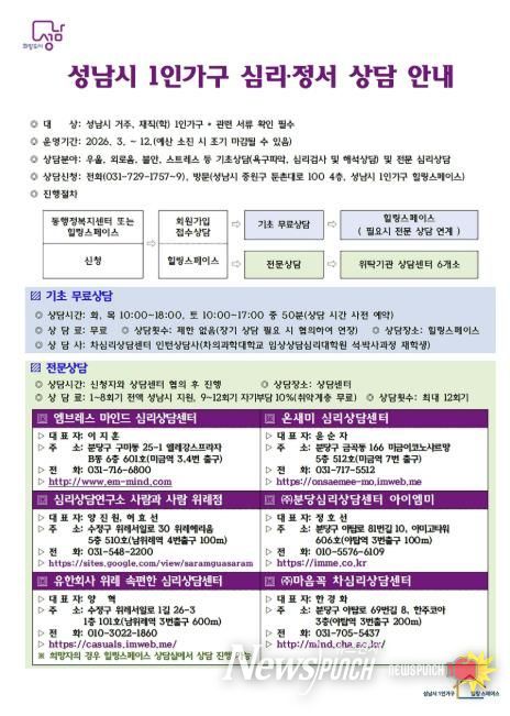 뉴스펀치 박상훈 기자 | 성남시는 우울감이나 외로움, 불안감, 스트레스로 어려움을 겪는 1인 가구에 전문적인 심리·정서 상담을 지원한다고 5일 밝혔다.