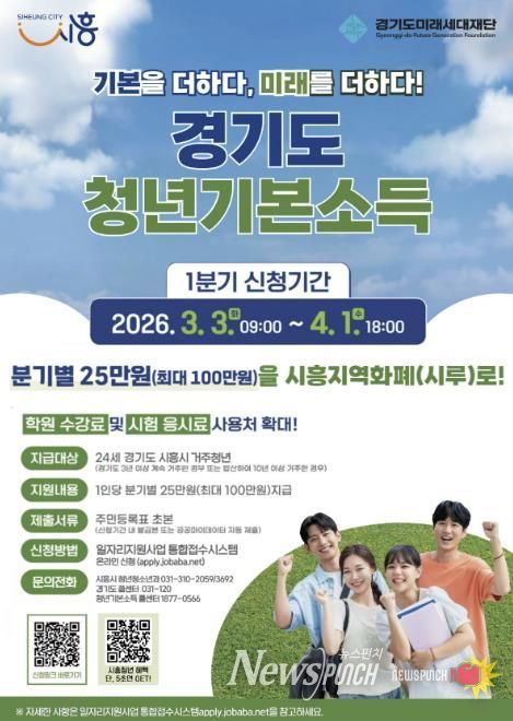 뉴스펀치 박상훈 기자 | 시흥시는 청년의 사회적 기본권 보장과 지역경제 활성화를 위해 4월 1일까지 ‘2026년 1분기 청년기본소득’ 지급 신청을 받는다.
