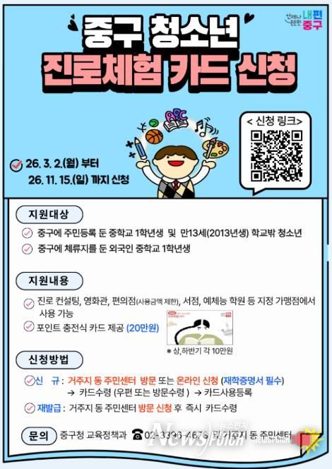 구 관계자는 "중구는 경제적 여건과 관계없이 모든 아이들이 스스로의 꿈을 찾을 수 있도록 지원하고 있다"며 "진로체험카드가 우리 청소년들에게 더 넓은 세상을 경험하고 미래를 설계하는 든든한 디딤돌이 되길 바란다”고 전했다