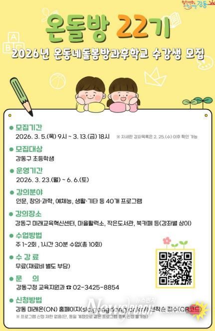 뉴스펀치 박상훈 기자 | 서울 강동구는 오는 3월 5일부터 13일까지 관내 초등학생을 대상으로 '온동네 돌봄 방과후 학교'(이하 온돌방) 22기 수강생을 모집한다고 밝혔다.