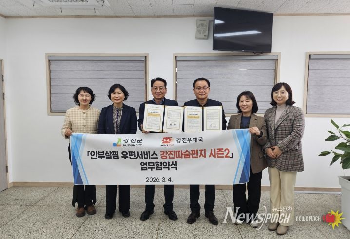 뉴스펀치 김용희 기자 | 강진군이 작년에 이어 올해에도 행정안전부 공모사업 ‘2026년 읍면동 스마트 복지‧안전서비스 개선 모델 개발 지원사업’의 ‘안부살핌 우편서비스’ 부문에 선정돼 국비 1천만 원과 우체국공익재단 8백만 원을 포함한 총 2천 8백만 원 규모의 예산을 투입해 촘촘한 복지 안전망 구축에 나섰다.