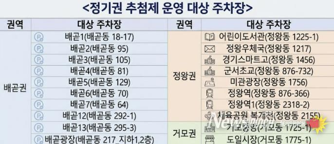 이번 추첨 대상 공영주차장은 배곧권의 배곧1~7호, 배곧12~13호, 배곧광장 10개소와 정왕권의 어린이도서관, 정왕우체국, 경기스마트고, 군서초교, 미관광장, 정왕역, 정왕역1, 체육공원 복개천 8개소, 거모권의 거모중앙, 도일시장 주차장 2개소를 포함하여 총 20개소다.