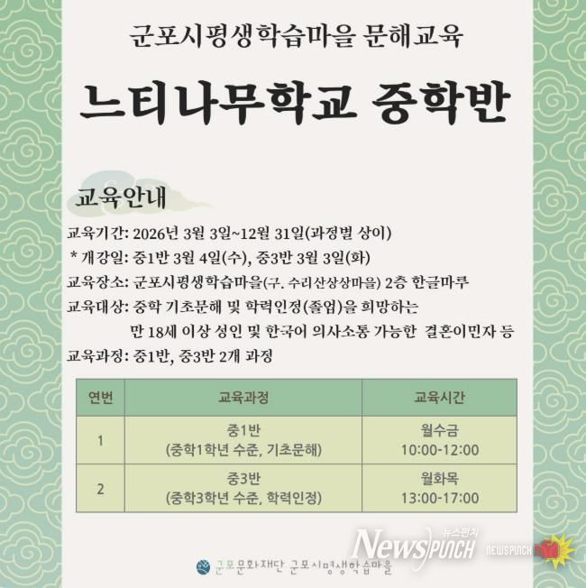 뉴스펀치 박상훈 기자 | 군포문화재단 군포시평생학습마을은 지난 3일 성인 문해교육 프로그램 ‘느티나무학교’를 개강했다고 밝혔다.