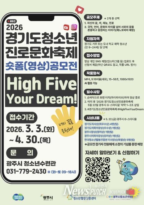 뉴스펀치 박상훈 기자 | 경기도청소년활동진흥센터와 광주시 청소년수련관은 오는 5월 22일 개최되는 ‘2026년 경기도 청소년 진로·문화 축제’를 앞두고 숏폼 영상 공모전 ‘High Five Your Dream!’을 운영한다고 5일 밝혔다.