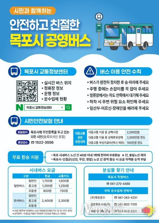 뉴스펀치 김용희 기자 | 목포시가 시민들의 안전하고 편리한 대중교통 이용을 위해 공영버스 관련 다양한 지원 제도와 이용 정보를 적극 안내하고 있다.