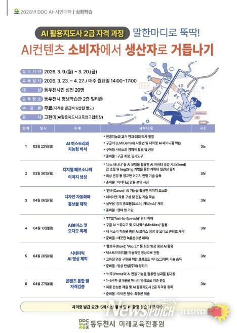 뉴스펀치 박상훈 기자 | 동두천시는 다가오는 인공지능(AI) 시대에 발맞춰 시민들의 디지털 미래 역량을 강화하기 위해 ‘2026년 DDC AI-시민대학’을 개최하고, 오는 3월 9일부터 수강생을 모집한다고 밝혔다.