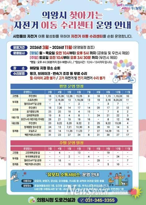 뉴스펀치 박상훈 기자 | 의왕시가 시민들의 자전거 이용 활성화와 안전한 자전거 문화 확산을 위해 '2026년 찾아가는 자전거 이동 수리센터'를 운영한다.