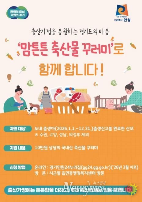 이에 따라 경기도에 주소를 두고 2026년 1월 1일~12월 31일까지 안성시에 자녀 출생신고를 마친 산모에게 1인당 10만 원 상당의 국내산 축산물 꾸러미를 지원한다.