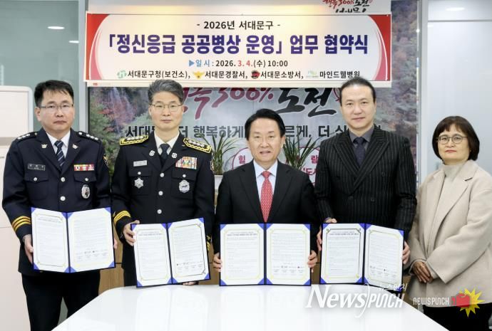 뉴스펀치 박상훈 기자 | 서대문구가 이달 4일 서대문경찰서, 서대문소방서, 마인드웰병원과 ‘정신응급 공공병상 운영 및 현장 대응 협력 체계’구축을 위한 업무협약을 체결했다.