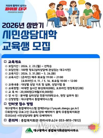 뉴스펀치 조평훈 기자 | 대구광역시 종합복지회관은 오는 3월 31일부터 5월 26일까지 심리상담에 관심 있는 일반 시민과 상담 관련 종사자를 대상으로 ‘2026년 상반기 시민상담대학’을 운영한다.