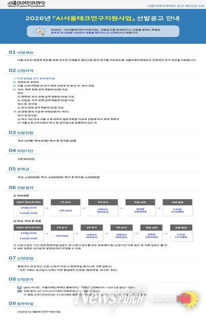 뉴스펀치 박상훈 기자 | 서울미래인재재단은 AI 연구 분야 이공계 전공 석·박사 재학생과 박사후 연구원 총 255명을 선발해 76억 원 규모의 연구지원금을 지원하는 ‘AI서울테크연구지원사업’을 새롭게 추진한다. 이를 통해 AI 분야 우수 인재들이 안정적인 환경에서 연구에 전념할 수 있도록 지원할 계획이다.