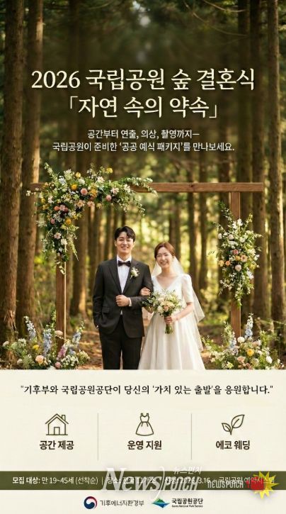 뉴스펀치 정홍균 기자 | 기후에너지환경부 산하 국립공원공단은 ‘고비용 예식’ 문제 해결에 도움을 주고 친환경 결혼 문화를 확산하기 위해 ‘2026년 국립공원 숲 결혼식 지원’ 서비스를 추진한다고 밝혔다.