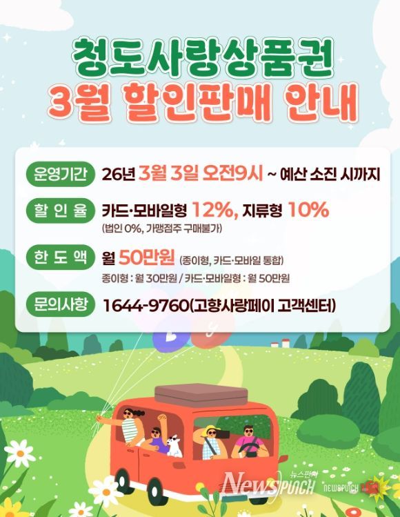 뉴스펀치 박세훈 기자 | 청도군은 지역경제 활성화와 소상공인 지원 강화를 위해 올해 3월부터 카드형 청도사랑상품권 할인율을 기존 10%에서 12%로 인상한다고 밝혔다.
