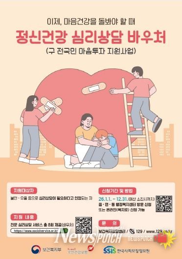 뉴스펀치 박세훈 기자 | 포항시는 우울과 불안 등 정서적 어려움을 겪는 시민들을 위해 지난해에 이어 올해도 전문 심리상담 서비스를 지원하는 ‘정신건강 심리상담 바우처 사업’을 추진한다고 밝혔다.