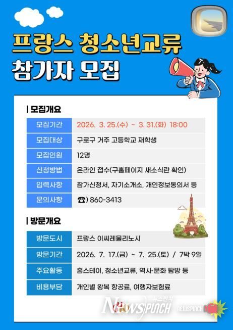 선발된 청소년은 7월 17일부터 25일까지 7박 9일 동안 구로구 자매도시인 프랑스 이씨레물리노시를 방문해 현지 가정 체험(홈스테이), 역사·문화를 체험하고 청소년 친교 활동 등을 펼칠 예정이다.