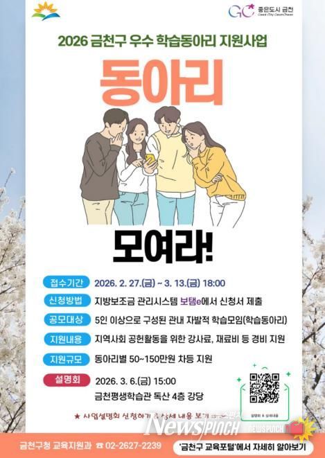 뉴스펀치 박상훈 기자 | 금천구는 오는 13일까지 ‘우수 학습동아리 지원사업’에 참여할 동아리를 공개모집한다고 밝혔다.