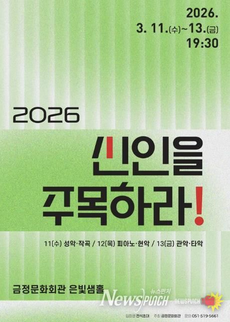 뉴스펀치 김윤걸 기자 | 부산 금정구 금정문화회관은 3월 11일부터 13일까지 은빛샘홀에서 젊은 연주가 육성 시리즈인 '2026 신인을 주목하라!’를 개최한다.