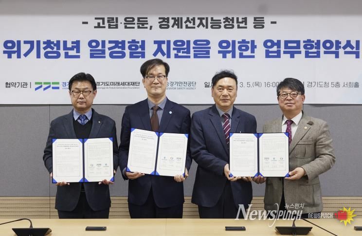 뉴스펀치 박상훈 기자 | 경기도와 경기도미래세대재단, 한국승강기안전공단 경인지역본부는 5일 경기도청 서희홀에서 ‘위기청년 일경험 지원을 위한 업무협약’을 체결했다.