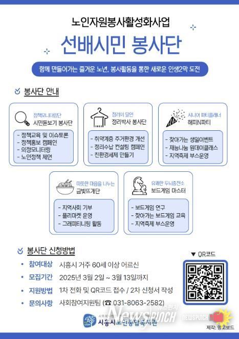 봉사단 인원은 총 10명을 선정할 계획으로, 모집 기간은 3월 13일까지다. 신청은 시흥시노인종합복지관 사회참여지원팀으로 전화하거나 홍보 포스터의 정보무늬(큐알코드)를 통해 하면 된다.