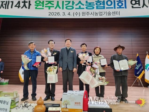 이날 원주시강소농협의회 제5대 회장으로 이학원 신임 회장이 취임했다. 또한 조경일 전임 회장을 비롯한 임원에게 시장 공로패가 수여됐으며, 우수회원 7명을 선발해 도지사 표창장 등을 전수했다.