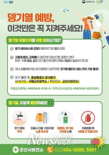 뉴스펀치 최영남 기자 | 군산시보건소는 지난해 지역거점 뎅기열 예방관리 사업을 통해 감시체계 구축과 예방홍보 활동을 체계적으로 추진해 왔으며, 올해도 뎅기열 예방관리 사업을 지속 추진한다고 밝혔다.