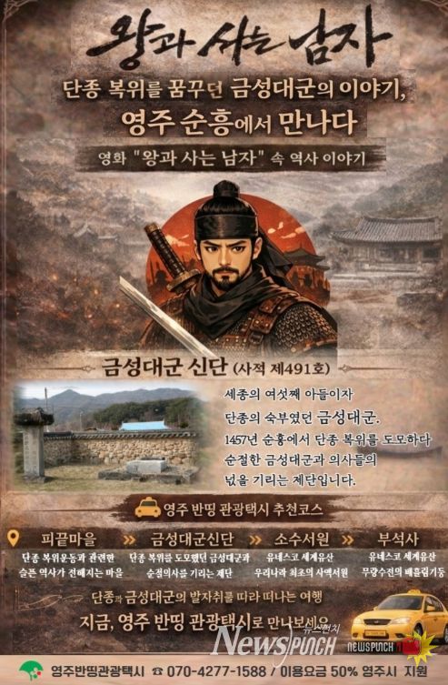 뉴스펀치 박세훈 기자 | 영주시는 관광객들이 반띵 관광택시를 이용해 영화 '왕과 사는 남자' 속 역사 이야기를 따라 순흥 일대의 주요 관광지를 둘러볼 수 있도록 추천 여행 코스를 소개했다.