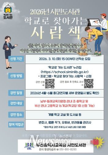 뉴스펀치 김윤걸 기자 | 부산광역시립시민도서관(관장 이은경)은 오는 4월부터 6월까지 부산 남부·동래교육지원청 관내 초·중학교 및 부산 관내 고등학교 등 16개교를 대상으로 ‘2026년 학교로 찾아가는 사람책’ 프로그램을 운영한다.