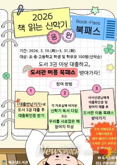 뉴스펀치 김윤걸 기자 | 부산광역시립해운대도서관(관장 노장석)은 오는 10일부터 31일까지 초·중·고등학교 학생 및 학부모 100명을 대상으로 ‘2026 책 읽는 신학기 응원 북패스’ 행사를 운영한다.