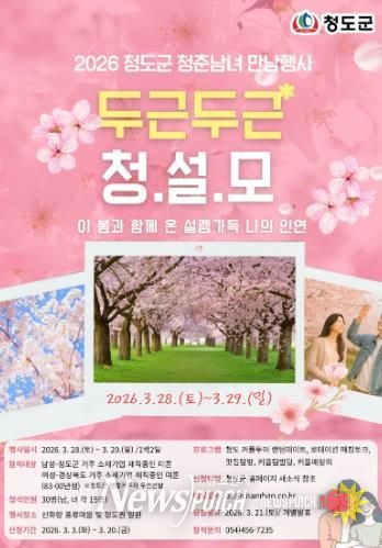 뉴스펀치 박세훈 기자 | 경북 청도군은 다가오는 봄을 맞아 바쁜 직장 생활로 인연을 만날 기회가 부족했던 청년들을 위해, 아름다운 청도 관광 명소를 여행하며 자연스럽게 인연을 찾는 미혼남녀 만남행사‘청(도)설(렘)모(임) 프로젝트’를 개최하고 참가자를 모집한다고 밝혔다.