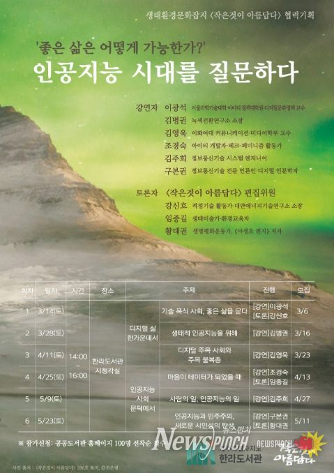 강연 일정은 ▲ 3월 14일 기술 폭식 사회, 좋은 삶을 묻다(이광석 교수, 강신호 편집위원) ▲ 3월 28일 생태적 인공지능을 위해(김병권 작가) ▲ 4월 11일 디지털 주목 사회와 주목 불복종(김영욱 교수) ▲ 4월 25일 마음이 데이터가 됐을 때(조경숙 작가, 임종길 편집위원) ▲ 5월 9일 사람의 일, 인공지능의 일(김주희 교수) ▲ 5월 23일 인공지능과 민주주의, 새로운 시민성의 탄생(구본권 기자, 황대권 편집위원)으로 구성됐다.