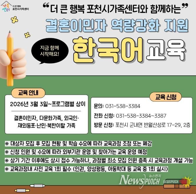 뉴스펀치 박상훈 기자 | 포천시 더 큰 행복 포천시가족센터는 2026년 결혼이민자 역량강화 지원 사업의 일환으로 한국어교육 과정을 수준별, 단계별 체계로 확대 개편하고 본격적인 운영에 들어갔다.