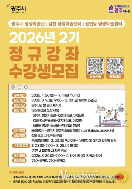 뉴스펀치 박상훈 기자 | 광주시는 오는 16일부터 20일까지 2026년 제2기 평생학습 프로그램 수강생을 모집한다고 6일 밝혔다.