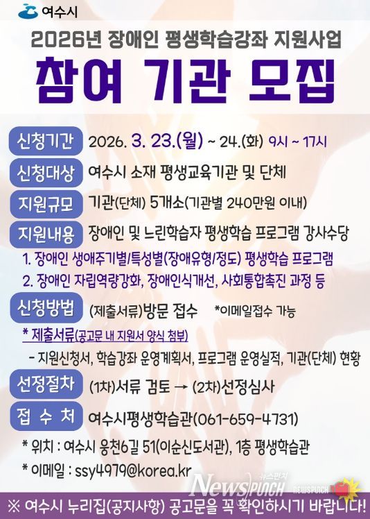 뉴스펀치 김용희 기자 | 여수시는 지역 내 장애인의 평생학습권 보장과 자립생활 능력 강화를 위해 '2026년 장애인 평생학습강좌 지원사업'에 참여할 기관·단체를 모집한다.