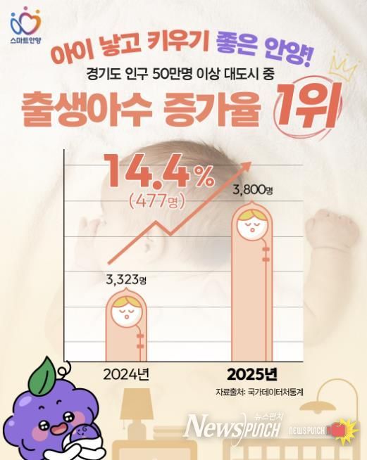 뉴스펀치 박상훈 기자 | 안양시는 지난해 경기도 인구 50만 이상 대도시 가운데 출생아 수 증가율 1위를 달성했다고 6일 밝혔다.