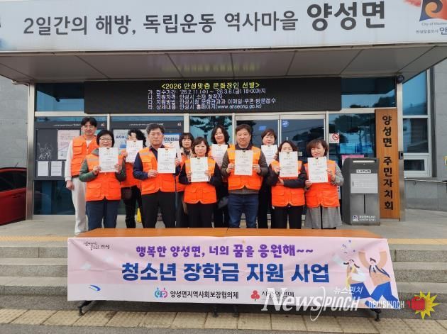 뉴스펀치 박상훈 기자 | 안성시 양성면지역사회보장협의체는 지난 5일 청소년의 꿈을 응원하기 위해 ‘청소년 장학금 지원 사업’을 실시하며 관내 초‧중‧고교 학생 13명에게 장학증서를 전달했다.