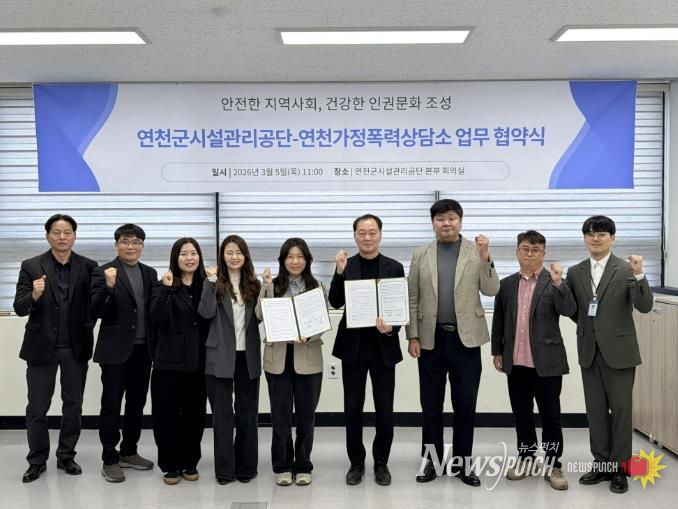 뉴스펀치 박상훈 기자 | 연천군시설관리공단은 가정폭력과 이로 인해 파생되는 아동학대 등 가정 내 폭력을 예방하고 피해자의 신속한 보호와 일상 회복을 실질적으로 지원하기 위해, 5일 연천가정폭력상담소와 '지역사회 폭력 예방 및 인권 증진을 위한 업무협약'을 체결했다고 밝혔다.