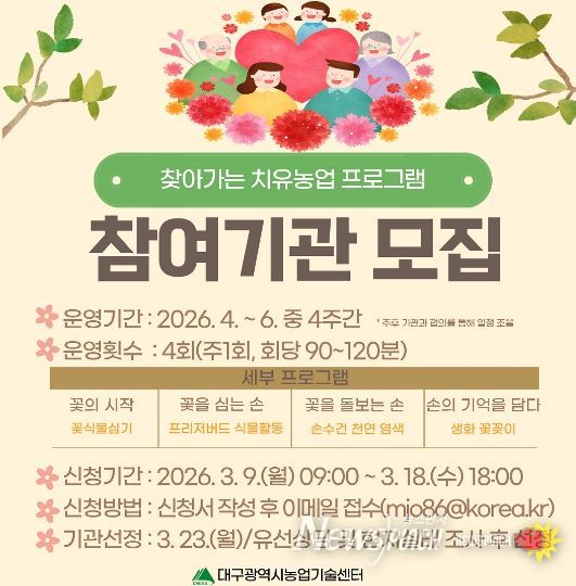 교육은 4월 7일 대구광역시농업기술센터 3층 강당에서 진행되며, 치유농업의 개념과 가치를 소개하고 마음챙김 치유농업 활동을 직접 체험할 수 있도록 구성된다.