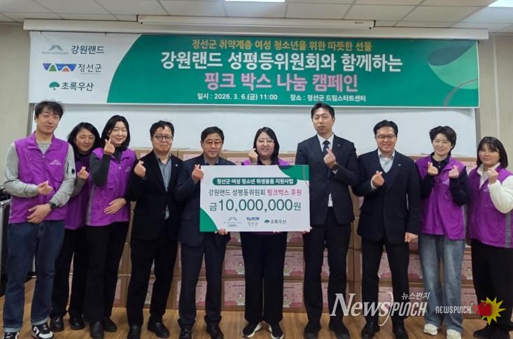 뉴스펀치 조평훈 기자 | 정선군은 3월 6일 정선군 여성회관 소회의실에서 강원랜드 성평등위원회와 초록우산 어린이재단 강원지역본부가 후원하는 ‘핑크박스’ 전달식을 개최했다.