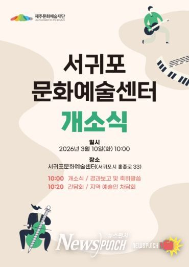 뉴스펀치 김용희 기자 | 제주문화예술재단은 오는 3월 10일 오전 10시 서귀포문화예술센터(서귀포시 홍중로 33)에서 개소식을 개최한다. 재단은 이번 개소를 계기로 산남지역 문화예술 지원 기능을 전담하는 거점 체계를 본격 운영할 계획이다.