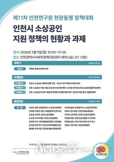 뉴스펀치 조평훈 기자 | 인천연구원은 2026년 3월 9일 오후 3시 인천광역시사회적경제지원센터 세미나실에서 “인천시 소상공인 지원 정책의 현황과 과제”라는 주제로 '제11차 현장동행 정책대화'를 개최한다.