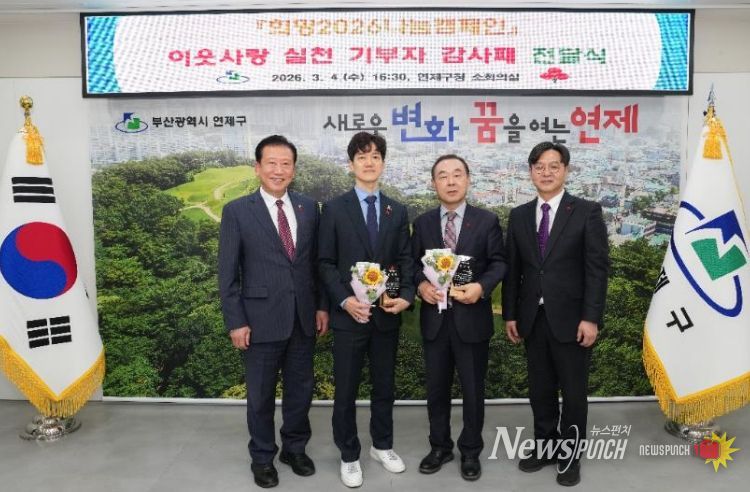 뉴스펀치 김윤걸 기자 | 연제구는 지난 3월 4일, 부산사회복지공동모금회(회장 이수태)와 함께 '희망2026나눔캠페인 이웃사랑 실천 기부자'에게 감사패를 전달했다.