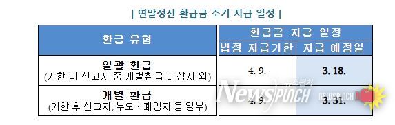 연말정산 환급금의 법정 지급기한은 4월 9일이지만, 국세청은 그보다 22일 이른 3월 18일에 연말정산 환급금을 회사에 지급할 예정이다.
