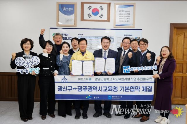 뉴스펀치 최영남 기자 | 광주시교육청은 6일 광산구청 청장실에서 이정선 교육감, 박병규 광산구청장 등이 참석한 가운데 ‘광일고등학교 학교복합시설 조성을 위한 기본 협약’(MOU)을 체결했다.