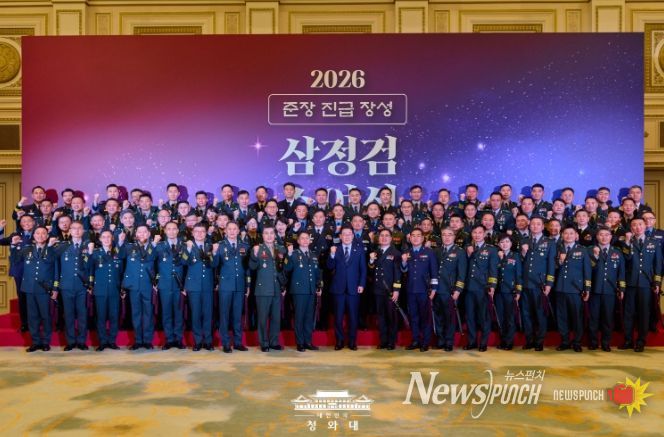 뉴스펀치 김용희 기자 | 이재명 대통령은 오늘 오후 청와대 영빈관에서 개최된 ‘26년 준장 진급자 삼정검 수여식 행사에 참석해 총 77명의 준장 진급자들에게 삼정검을 수여했다.