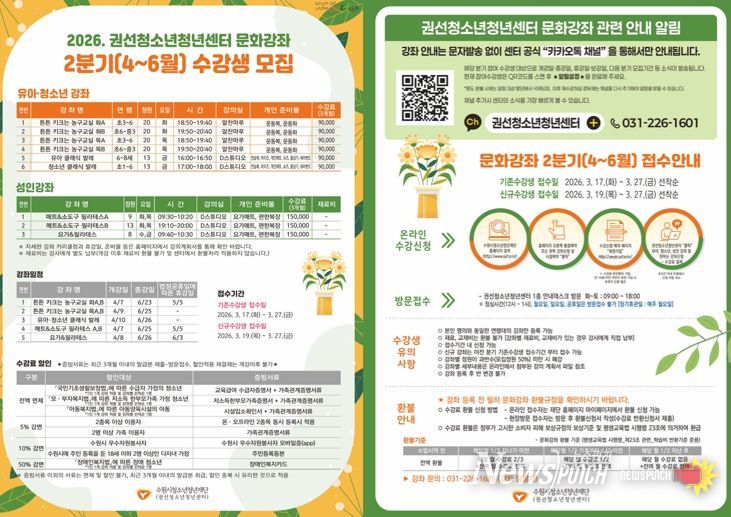 뉴스펀치 박상훈 기자 | 수원시청소년청년재단 권선청소년청년센터는 오는 3월 17일부터 3월 27일까지 지역사회 평생학습 문화강좌 2분기(4~6월) 수강생을 모집한다.