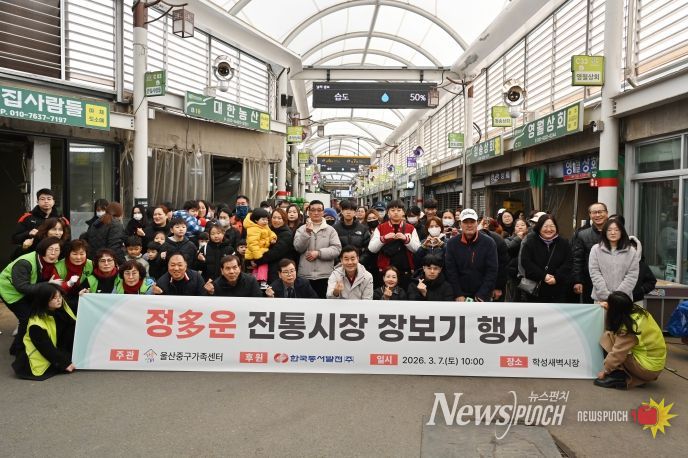 뉴스펀치 김윤걸 기자 | 울산중구가족센터가 한국동서발전㈜의 후원을 바탕으로 3월 7일 오전 10시 학성새벽시장에서 저소득 가정과 함께하는 ‘정多운 전통시장 장보기 행사’를 진행했다.